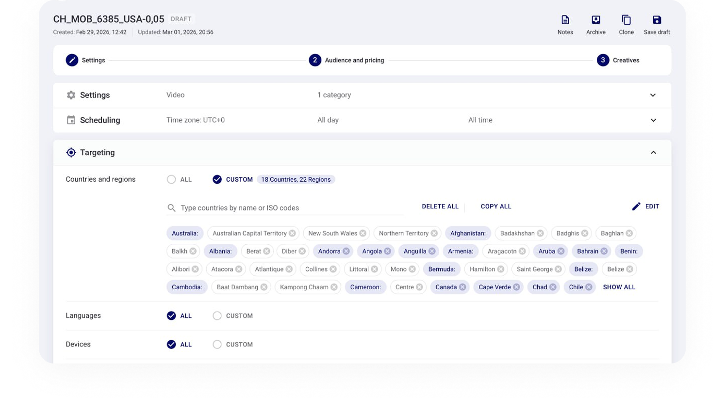 Target audiences across 190+ countries with precise filters by geo, device, browser, and time zones