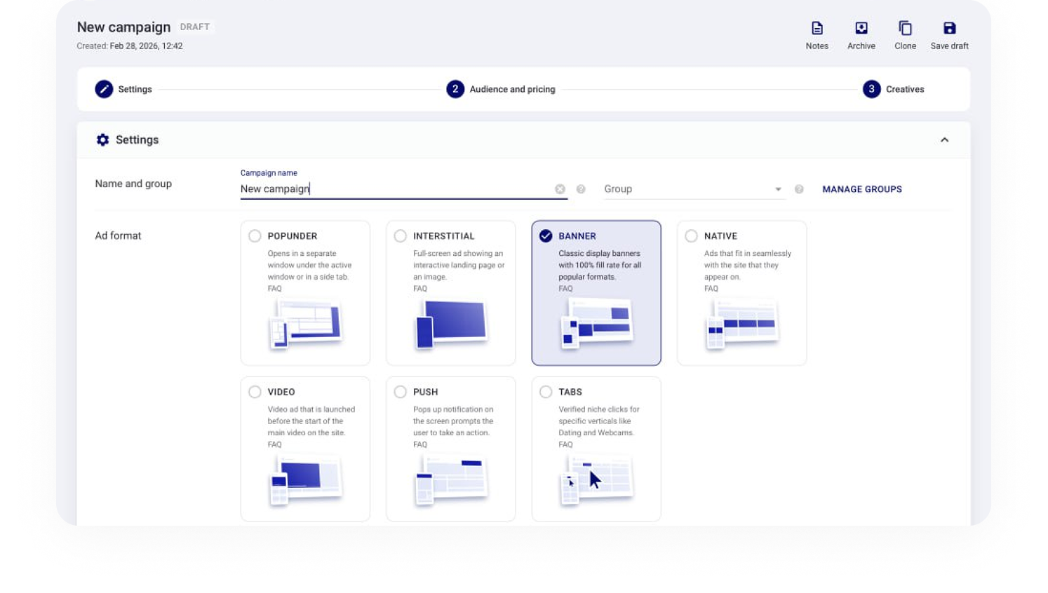 Set up your campaign in minutes by selecting your targeting options and ad formats